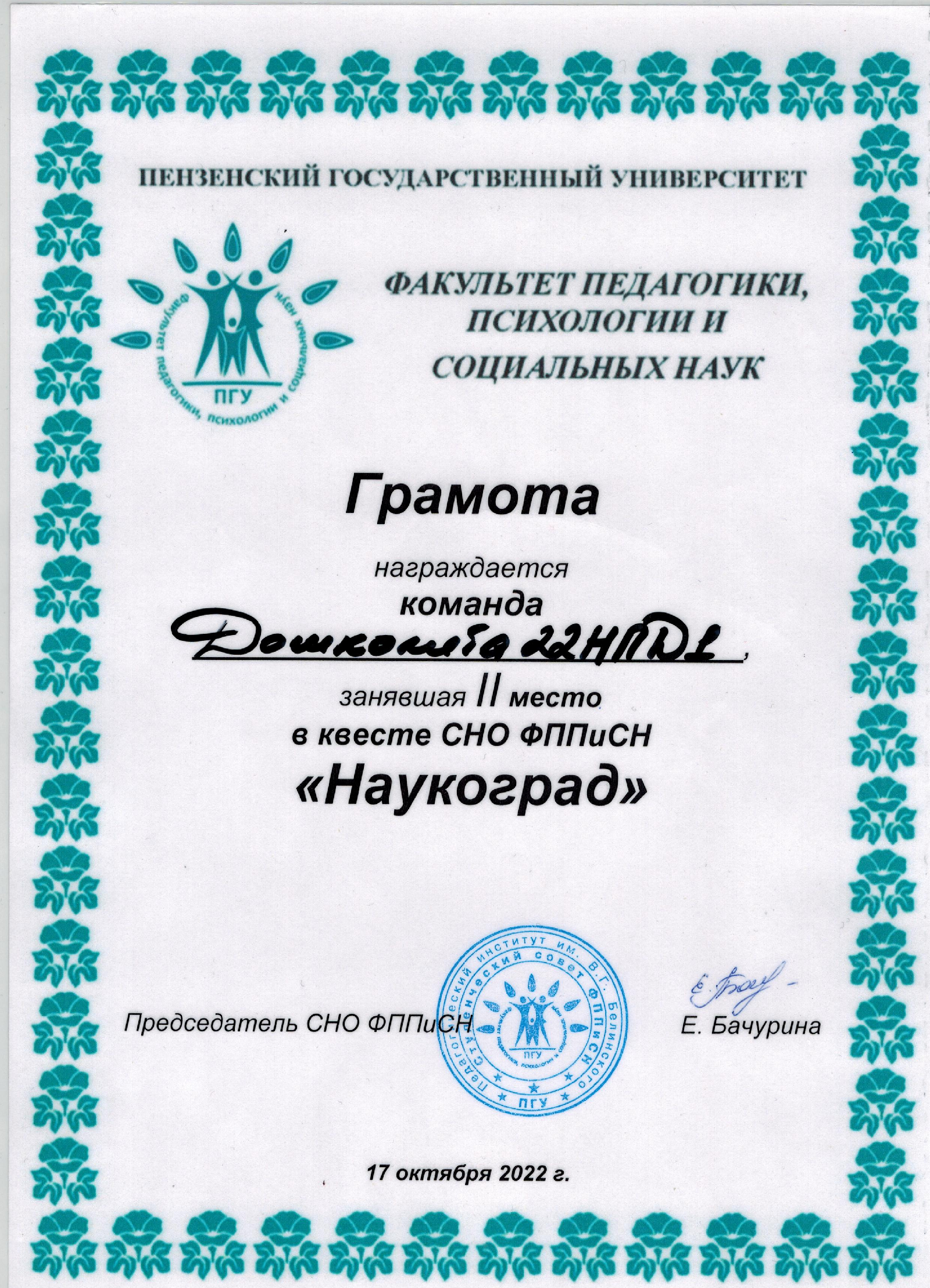 17 октября на факультете состоялась ежегодная квест-игра для первокурсников "Наукоград". Команды с радостью прошли забавные испытания, которые приготовило для них студенческое научное общество факультета. Головоломки, загадки, ребусы, творческие задания... За каждой новой дверью сегодня наших первокурсников поджидало очередное испытание, и с каждым они справились на «отлично»! Второе место заняла команда группы 22НПД1.