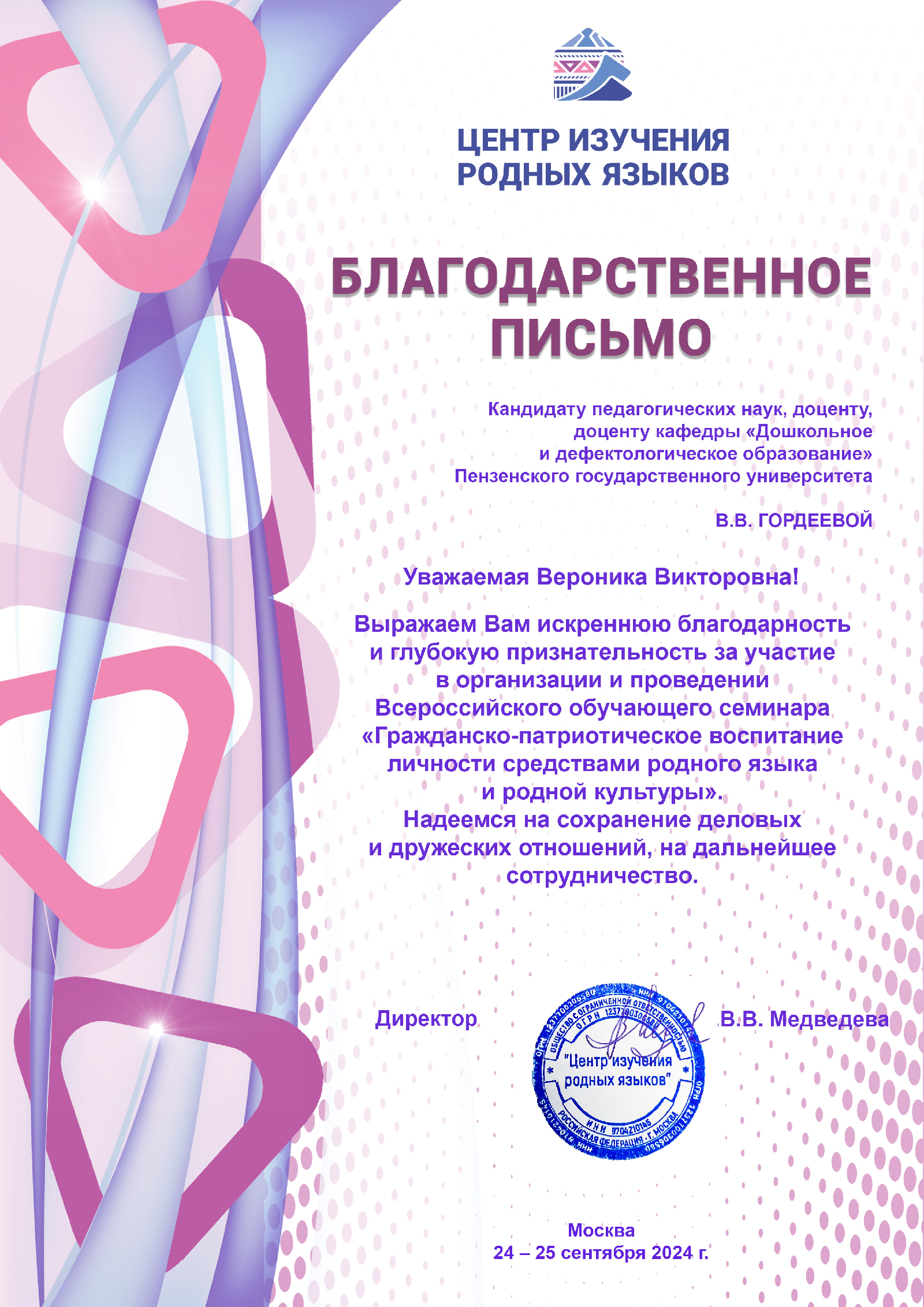 | 20.10.2024 11:08 | Благодарность за педагогическое и научное сопровождение участника Всероссийского конкурса «Моя страна – моя Россия» |