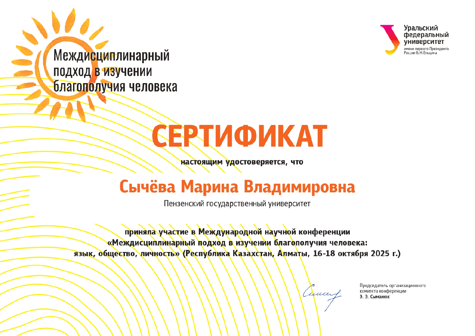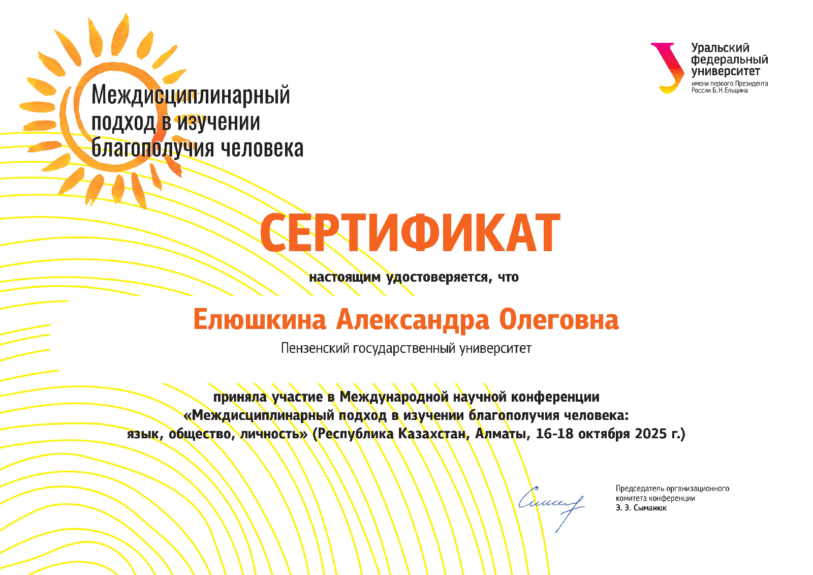 Доцент кафедры М.В. Сычёва и студентка группы 22НПД1 А. Елюшкина приняли участие в секционном заседании международной научной конференции «Междисциплинарный подход в изучении благополучия человека: язык, общество, личность». В масштабном мероприятии приняли участие более 150 ученых и исследователей из Казахстана, России, Узбекистана, Кыргызстана и Албании.